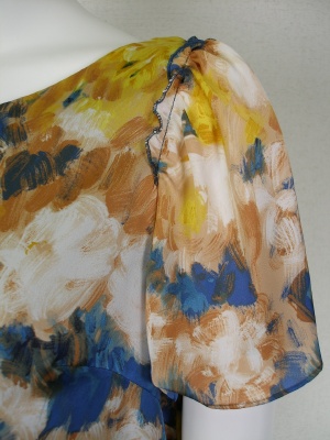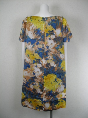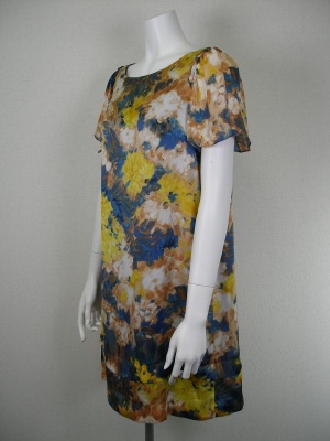 くすんだブルーにイエローの花柄が印象的なワンピース。お袖はフレアーで二の腕をスッキリ見せます。裏地もポリエステル。