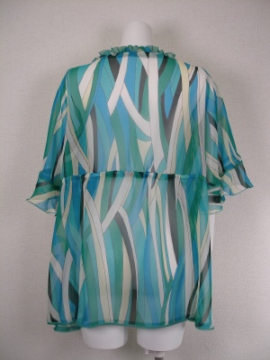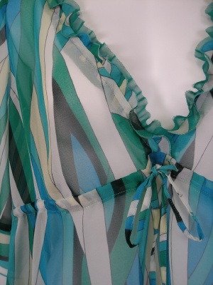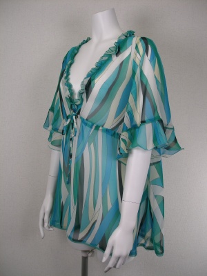 ポリエステルのシフォンで軽く透ける素材。バスト下のリボンをもっと絞る事もできます。お袖はフレアー、裏地無し。