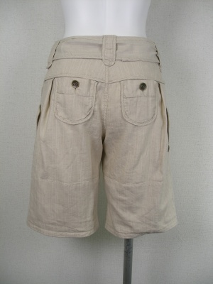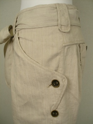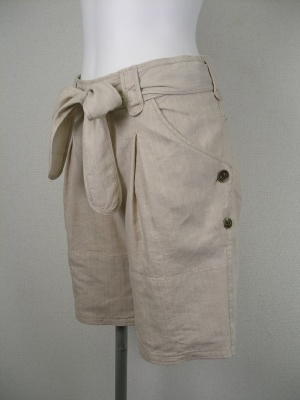 麻ベースの涼しげな素材。(ネップは素材の特徴で、織りキズではございません)裾をロールアップしてサイドのボタンで留めればショートパンツに。裏地無し、ベルトは外せます。