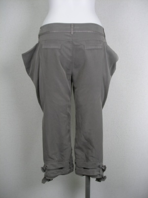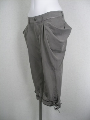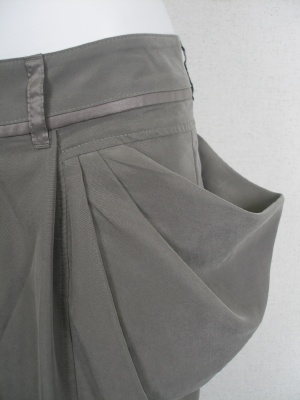 ヒップから腿までがややゆったり、膝下はタイトなサルエルパンツ。張り出したポケットがその特徴を強調しつつ、体型カバーもできます。柔らかい素材(テンセル)と太すぎないシルエットがエレガント。