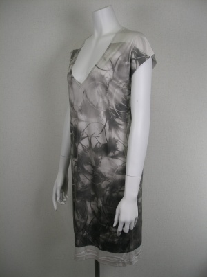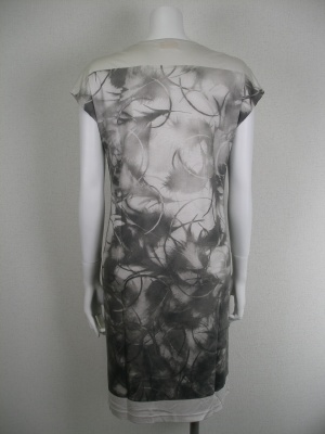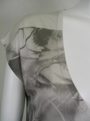 ソフトで肌触りの良いレーヨン素材。深いVネックなのでキャミソールなどを重ね着して。羽毛をデザイン化したようなプリント。裏地無し。