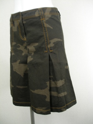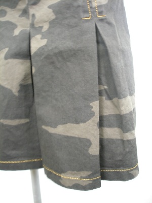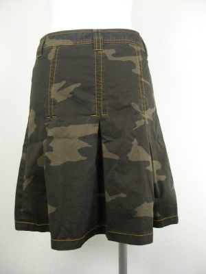 綿100%の迷彩プリントスカート。腰まで縫い止めなのでスッキリ見えます。カーキ系の柄にオレンジ色のステッチがアクセント。裏地無し。