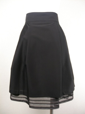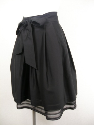 ウエストのタックでふんわり広がるスカート。シースルーのシルク混素材が裾からのぞきます。リボンベルトは外せます。