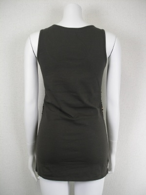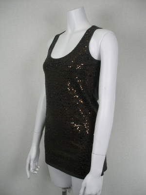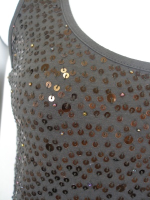 綿ストレッチのカジュアル素材に、前面のみスパンコールとビーズを散りばめてあります。