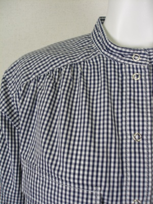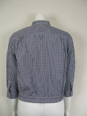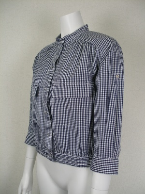 ネイビー×白のギンガムチェック。ブルゾンのようなデザインのブラウスです。ショート丈でお袖はロールアップしてボタンで留められます。