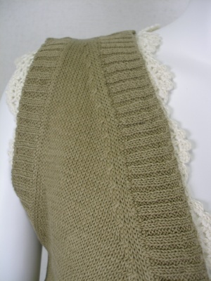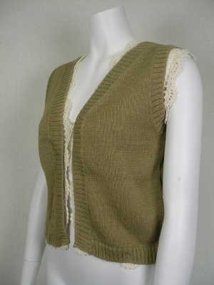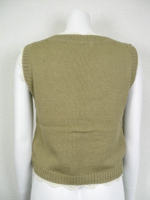 コットン100%のニットと、麻100%の総レース編みのインナーの2枚仕立てのベスト。2枚を留めてあるボタンを外して、別々で着ることができます。