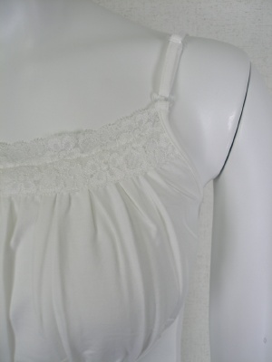 胸元にレースをほどこしたキャミ バストを包むようにギャザーを寄せてあります、肩ヒモ調整可能