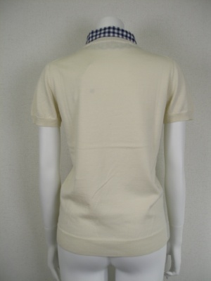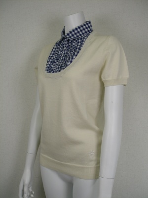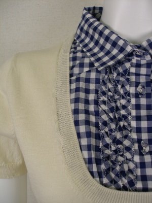 無地の綿ニットに、ギンガムチェックの綿シャツを重ねたようなデザイン。シャツの部分はボタンで取り外せますので、キャミソールなどとも重ね着を楽しめます。