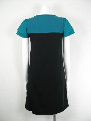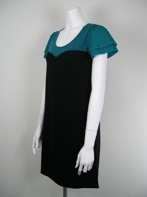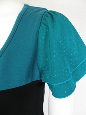 胸元が異素材で切り替えになったデザイン、生地はカットソーの素材で袖ははシフォンのよう、さらに二枚重ね・・ドット模様