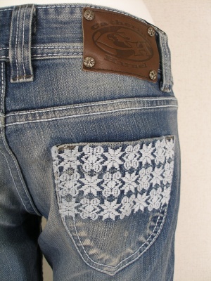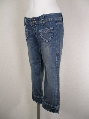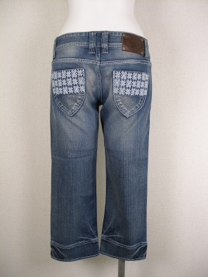 白のステッチとヒップポケットの刺繍がポイントの、スッキリ細身クロップドデニム。裾にスリット入りでストレッチ素材です。