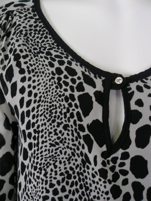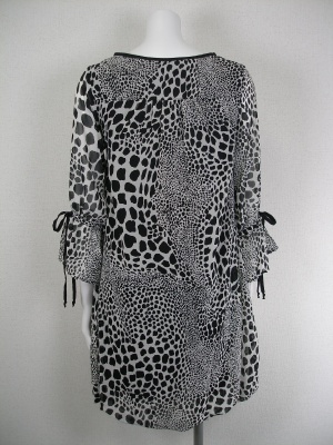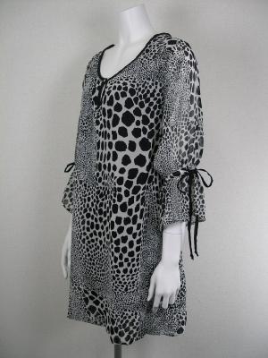 アニマル柄ですが、お袖のリボンやバルーンになった裾など、デザインは甘口です。ポリエステルのシフォンで裏地付き、お袖は一重なのでほんのり透けます。