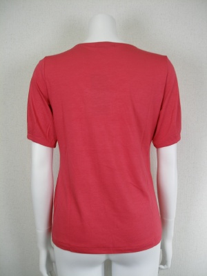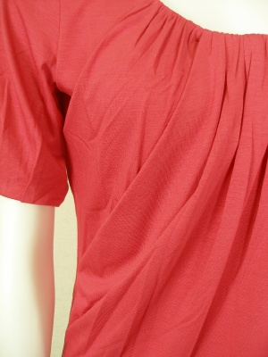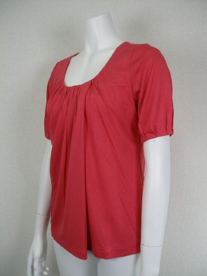 とろりとした素材感が素肌に気持ちよいカットソー。胸元のギャザーによって作られるドレープがキレイ。赤に近いピンクです。