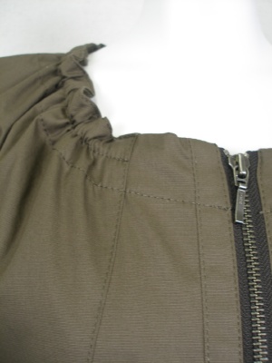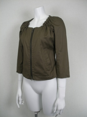 紐を絞ってネック周りにギャザーを寄せるジップアップジャケット。少しストレッチの効いた薄手の綿素材で、軽いはおりとして夏まで重宝しそう。裏地無し
