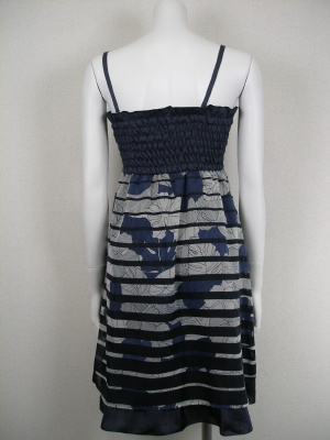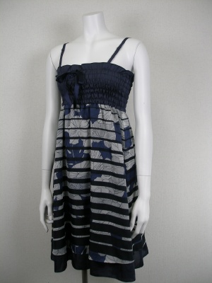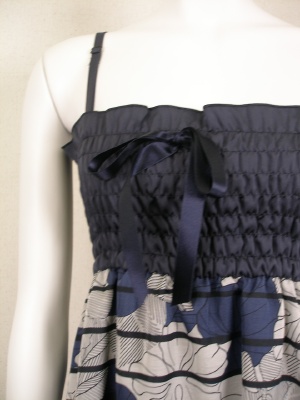 胸元のシャーリングが程よく胸のラインを包み込んでます。キュートなりぼんがとてもエレガント。大人っぽい柄のキャミワンピ