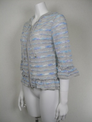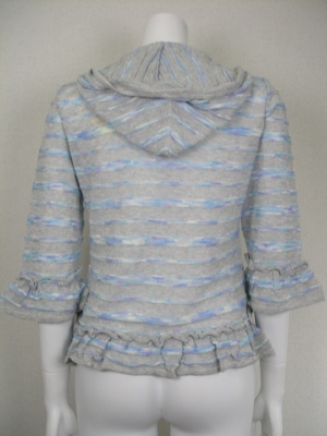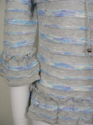 染めのような織りと無地を交互にデザインしたニットのパーカ 袖口と裾にフリンジを付けたタイプ