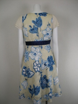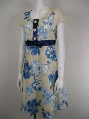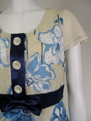 ハイウエスト切り替えのワンピース。サテン地のリボン ボタンの部分は開くことはできます。着脱は脇ファスナーがあります。