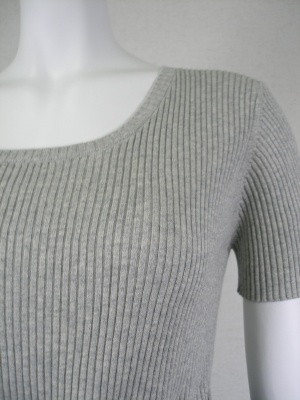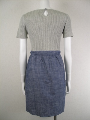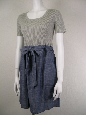 ダンガリー生地をスカート部分に用いてます。ウエストは共のリボンで絞って調整します。ニット部分はリブ(コットン100%)裏なし