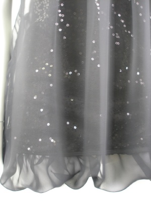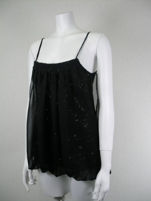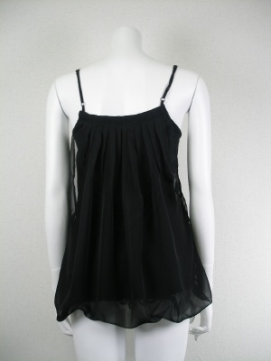 2枚重ねのキャミ、上下で縫い合わさってます。下地は前身頃だけスパンコール付き。上からシフォン地でふんわりバルーン型に・・ ヒモ調整できます