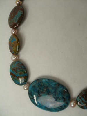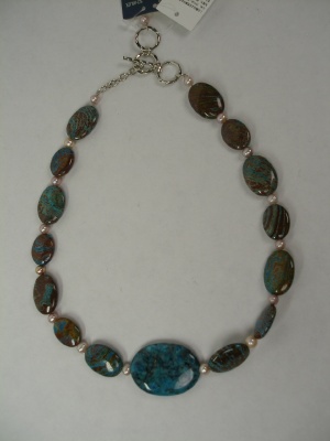 天然石と淡水パールのネックレス。天然石はブルーとブラウンが混じった色合いです。
