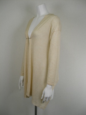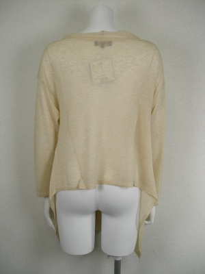 薄く繊細な素材のカーディガン。大判ストールを肩からかけ袖をつけたようなデザインなので、フロントからサイドが長めで後ろが短くなります。付属のピンで留めずに羽織るだけでもキレイです。