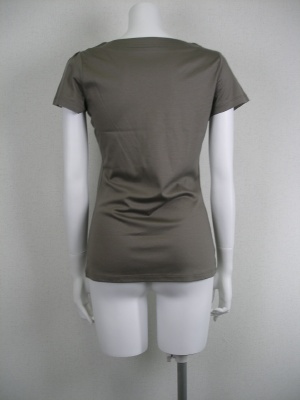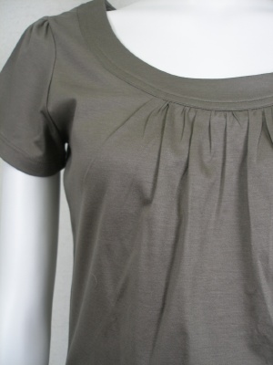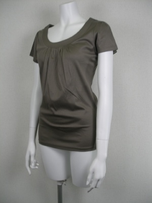 程よくあいたラウンドネックと、胸元のギャザーがとてもきれいなカットソー。1枚でも、ジャケットのインナーでも。かすかに光沢のある素材です。