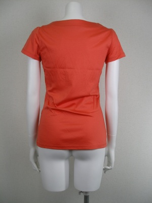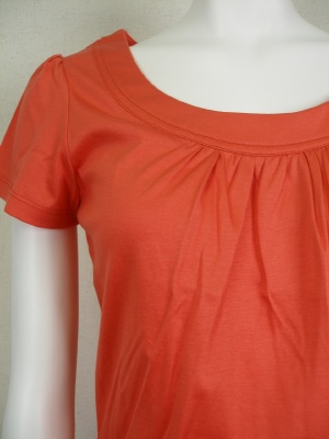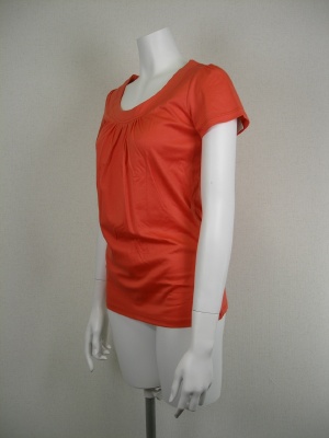 程よくあいたラウンドネックと、胸元のギャザーがとてもきれいなカットソー。1枚でも、ジャケットのインナーでも。かすかに光沢のある素材です。