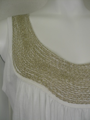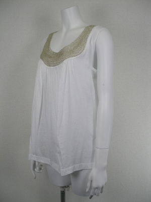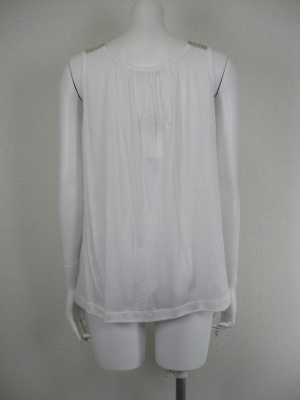 胸元にラメ糸の刺繍をほどこしたノースリーブカットソー。全体にゆったりしたサイズ感なので、インナーとの重ね着を楽しみたい。