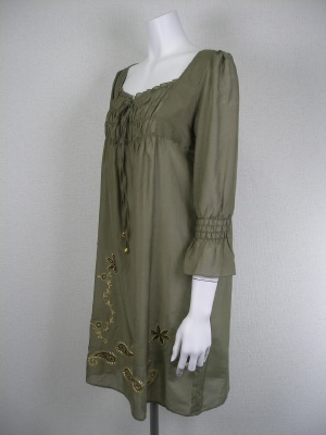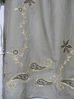 コットン・シルクの薄手で上質な素材で、やや光沢があります。ゴールドの刺繍とビーズ使いが華やかで、付属のストールにも同様の刺繍。裏地なし。