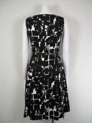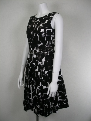 コットンの上品なワンピース。白地に黒とダークブラウンの柄が涼しげです。暑い日でも過ごしやすいよう、サラッとしたキュプラの裏地をトップ部分のみ付けています。スカート部分はややふんわりして透けないので裏地はありません。