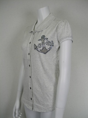 ポロシャツタイプのカットソー。ビーズやスパンコールのワンポイントがとてもマリンな雰囲気。綿97%・ポリウレタン3%。