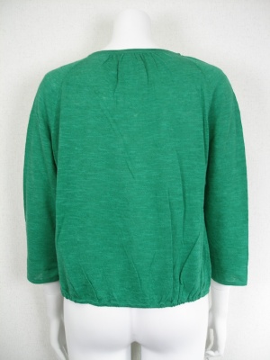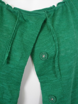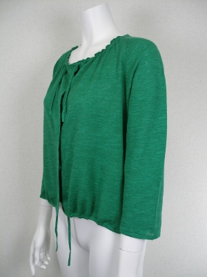 麻67%・綿33%で、さらさら気持ちの良い素材です。キレイなグリーンですが派手ではなくナチュラルな雰囲気。フロントはスナップボタン留めで、ヒモでギャザーを調節します。