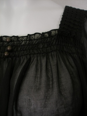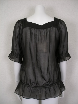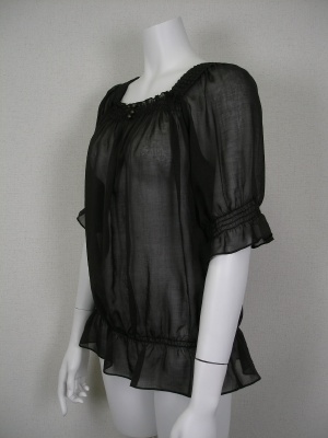 綿・ポリエステルの透ける素材。スクエアネックと五分袖で着やせ効果もあります。袖口と裾はゴム入りでふんわりしたシルエットです。