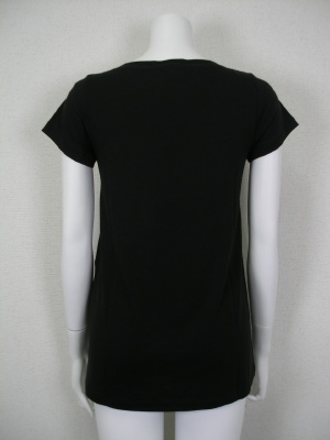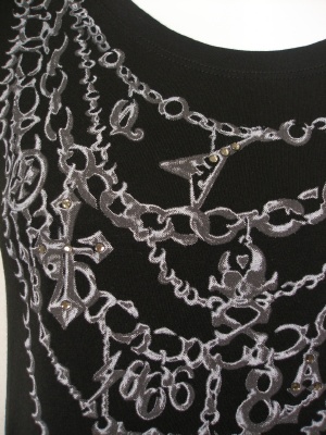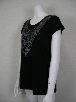 ネックレスをジャラジャラ付けたようなプリントのAラインTシャツ。綿55%・レーヨン45%の柔らかい素材。