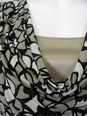 胸元のドレープやウエストのギャザーがスタイル良く見せてくれるワンピース。トロンとしたポリエステル素材でシワになりません。キャミソールを重ね着したようなデザインで、裏地付き。着丈91cm、袖丈21p。