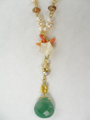 アベンチュリン・サンゴ・シェル・淡水パール・ローズクオーツ・グラスビーズ・メタルを使用。長さ41p・アジャスター6cm・Y字になった先の長さ5cm。