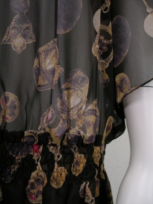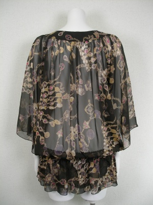 ポリエステルシフォンのチュニックブラウス。シャーリング入りでブラウジングします。着丈は伸ばした状態で73p、ブラウジングするとヒップの下くらいの丈になります。