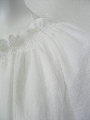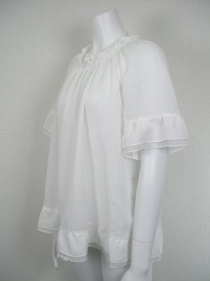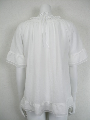 ネックラインのシャーリングと裾のフリルが可愛い真っ白なブラウス。シャーリング部分のヒモを後ろで結んでさりげないアクセントに。ポリエステルの薄く軽い素材。