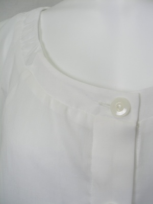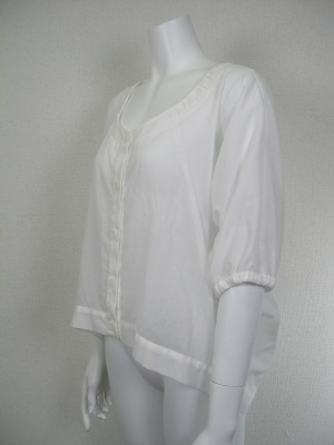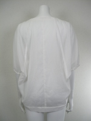 前は短く後ろは長いデザインのブラウス。ポリエステル65%・綿35%の薄く、やや透ける素材。袖口にはゴム入りで、全体に丸いシルエットです。