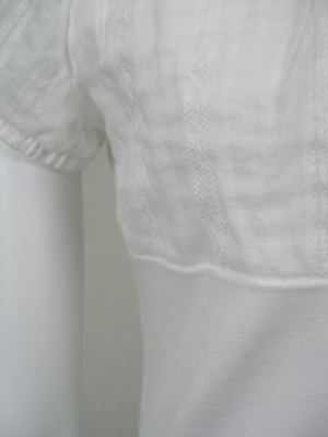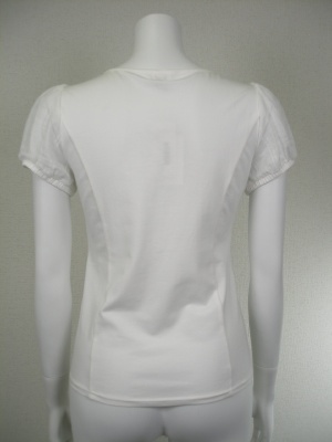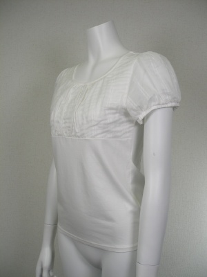 ストレッチの効いた素材に別布を重ねてあります。綿57%・リヨセル38%・ポリウレタン5%、バストと袖部分は綿100%。袖のみ透けます。