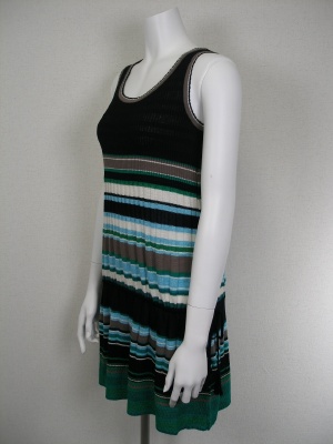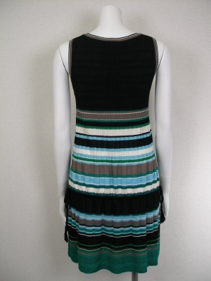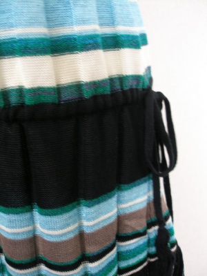 上は細いリブ、中は太いリブ、と編み方を変えて変化を出したニットワンピース。レーヨン87%・アクリル・綿・ナイロン、裏地なし。ローウエストにヒモを通してあり絞ってブラウジングできます。