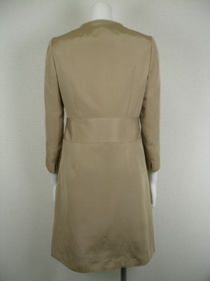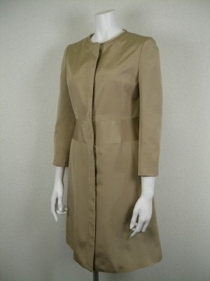 やや光沢があり柔らかな素材の、軽めコート。裏地はキュプラでブラウンのストライプ。