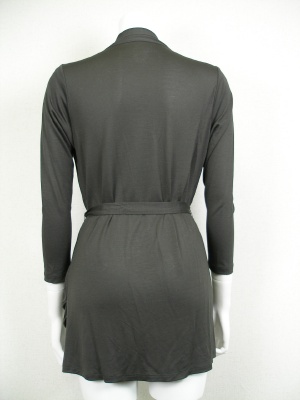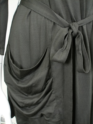 ポケットのドレープが印象的なロングカーディガン。ベルトを後ろで結んで前を開けた着こなしもおすすめです。