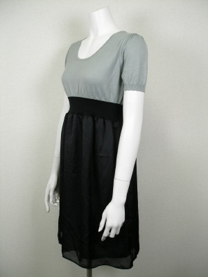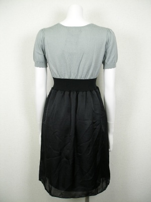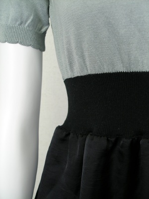 ハイウエスト切り替えワンピース。上はニット、ウエストはリブでスカートは光沢のあるポリエステル。スカート部分のみ裏地付き。