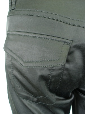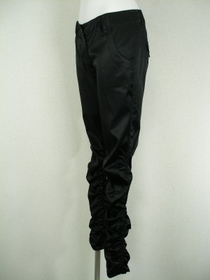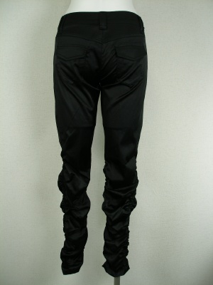 光沢のあるギャザーパンツ。ぴったりフィットするのでブーツインできます。
