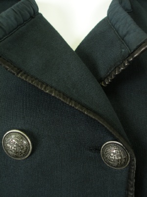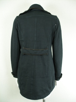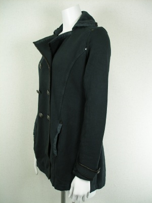 カジュアルな裏毛のコート。ピーコート風のデザインですが、気軽に羽織れるタイプです。パイピングに一部羊革を使用。