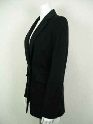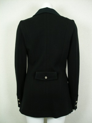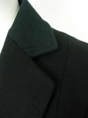 ロングジャケット・・生地はカットソー地なので伸縮がある。襟は濃紺に見える黒のテレコを使用、1つボタンで、袖はカフス(折り返すと細かなドット地がのぞく)