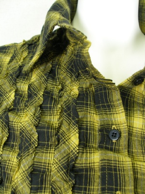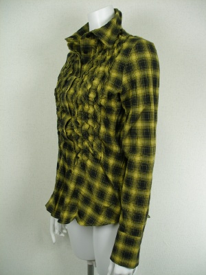 キャサリンハーネルの普通丈シャツ。襟にワイヤー入り。イエロー×ブラウンのチェック柄。