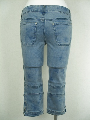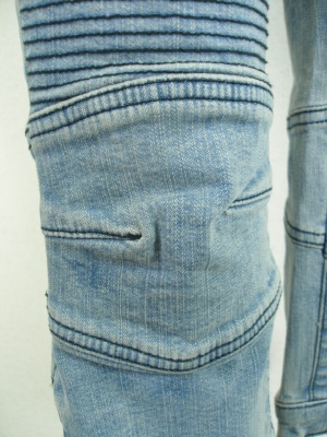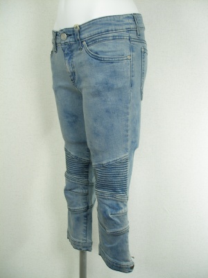 ストレッチが効いていてピッタリ細身です。ブリーチ具合は一点一点違うので写真よりムラが多くなる場合もございますが、全体的に薄めの色です。
