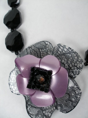 レース柄の花びらの上にパープルのお花、その上に黒のパーツを乗せたボリューミーなネックレス。