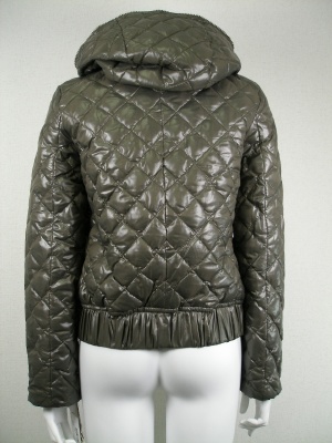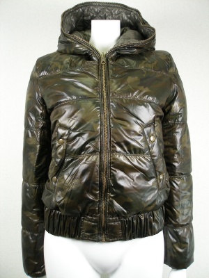 カーキ系のダウンジャケット リバーシブルで一方は迷彩柄、フードは取り外せません